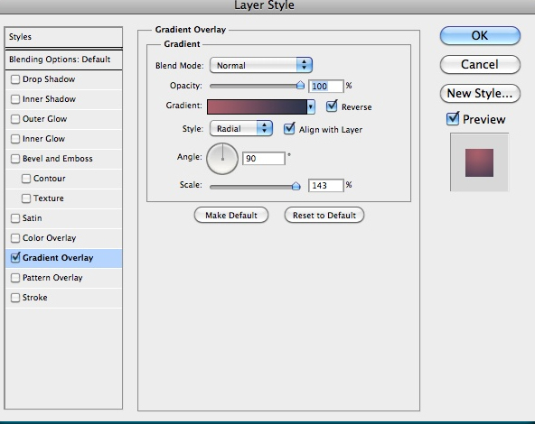 Выберите фоновый слой и зайдите в Layer> Layer Styles> Gradient Overlay. Используйте цвета (# aa616b) и (# 2c354d) для радиального градиента.