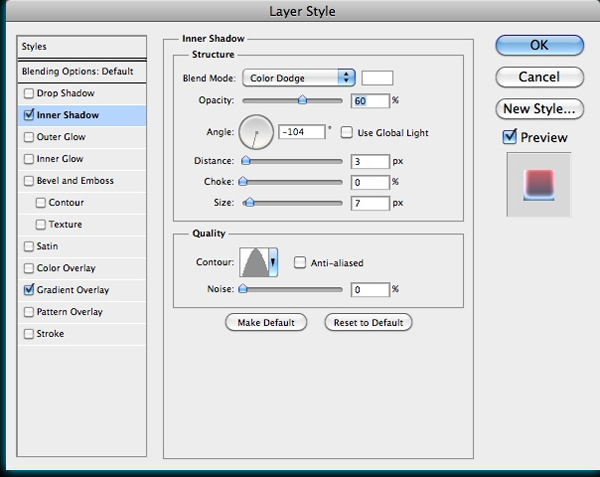 Перейдите в Layer> Layer Styles> Gradient Overlay. Примените градиент от темно-красного до светло-голубого в линейном режиме. Вы можете также попробовать применить радиальный градиент, если хотите.
