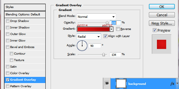 Откройте Photoshop и создайте новый документ размером 800px шириной и высотой 700px. Разблокируйте background layer («фоновый слой») и откройте окно Layer Styles («стили слоя»). Активируйте Gradient Overlay («градиентное наложение») и Radial style («радиальный стиль») с настройками, показанными на изображении ниже.