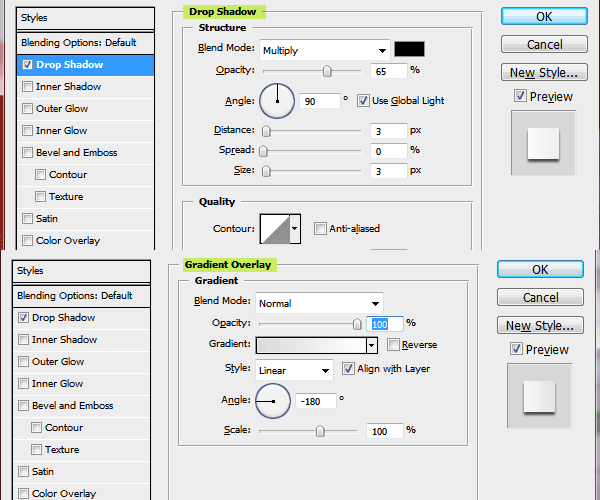 Добавьте слегка drop shadow («отбрасывание тени»). Установите 3pxs для distance («расстояние») и также 3pxs для size («размер»). Также добавьте едва различимый серый цвет к белому градиенту на тексте. Смотрите подробнее на изображении ниже.