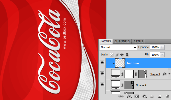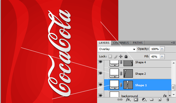 Время добавить некоторые детали к красному фону. Самый лучший способ сделать это – взглянуть на настоящую банку «Кока-Колы» и попытаться её скопировать. Чем больше деталей Вы добавите, тем более реалистично она будет выглядеть.