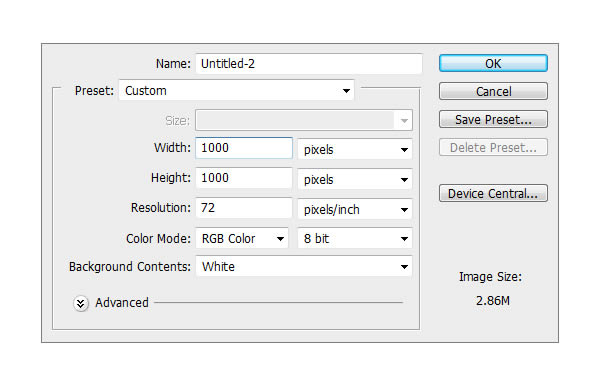 Создайте новый файл. Установите Ширину до 1000 и высоту 1000 с разрешением до 72 PPI.