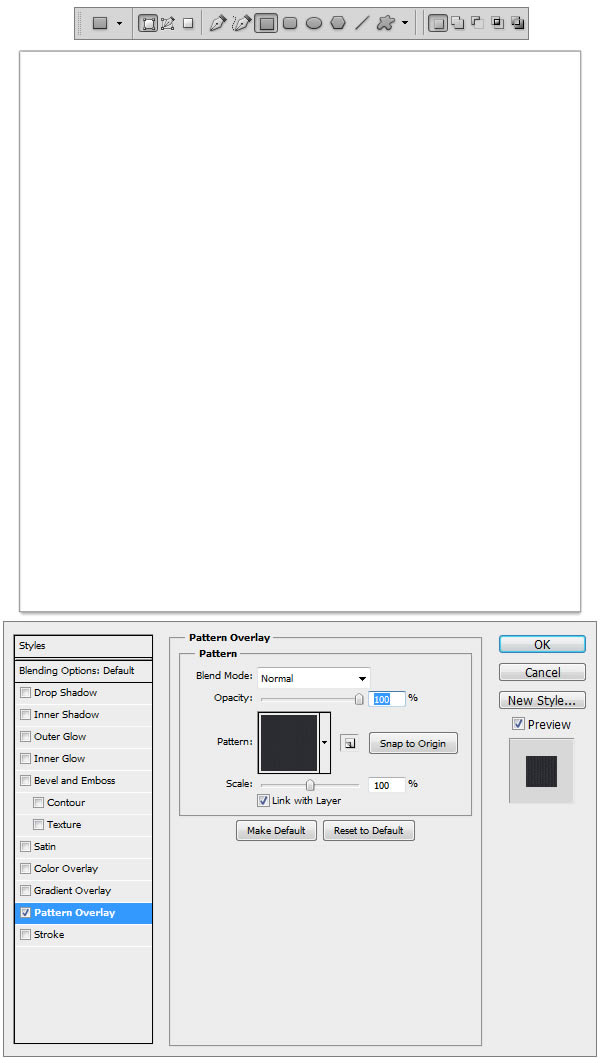 Создайте новую группу и назовите ее фон. Теперь загрузите шаблон ткани из ресурсов. Используя Rectangle Tool (U) нарисуйте прямоугольник немного больше размером, чем холст, и примените шаблон в стиле формы слоя.
