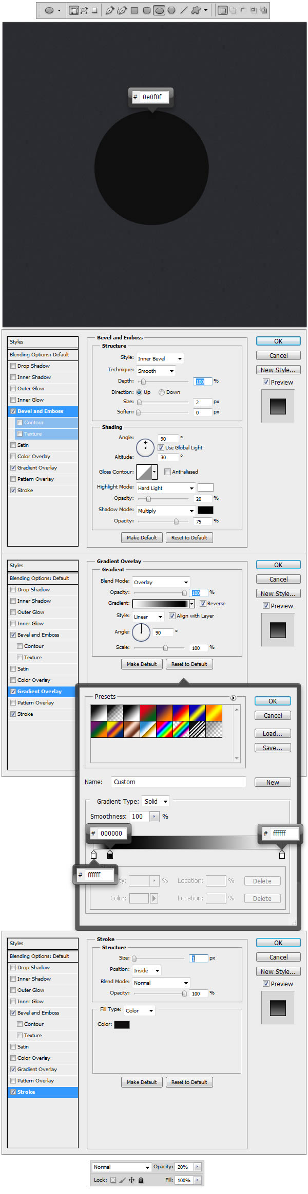 Создайте новую группу и назовите ее кнопка. Используя Elipse Tool (U) нарисуйте круг, как на примере ниже. Установите цвет # 0e0f0f и примените стили слоя. После того как вы применили стили слоя, уменьшите непрозрачность до 20%.
