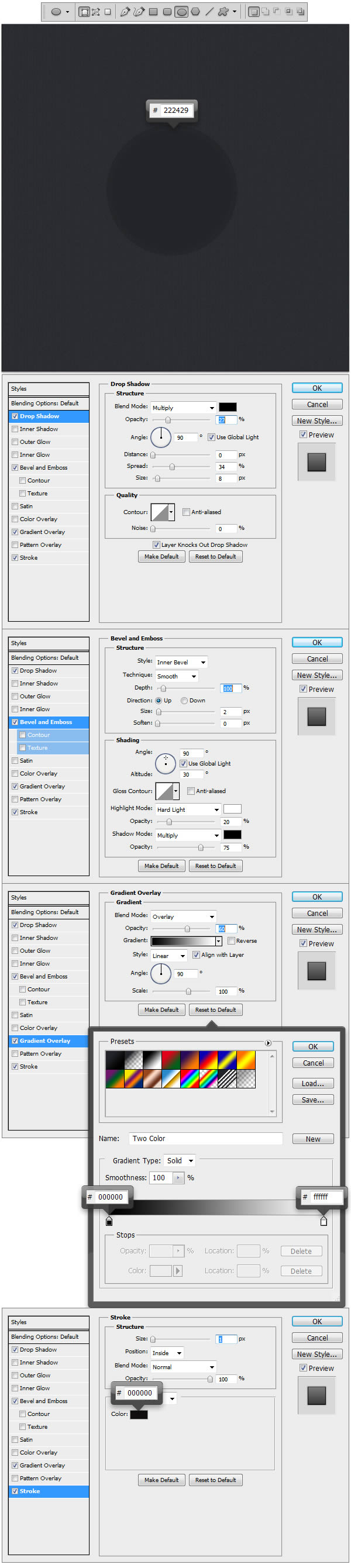 Теперь сделайте еще один круг, на этот раз немного меньше, установите цвет # 222429 и примените следующие стили слоя.