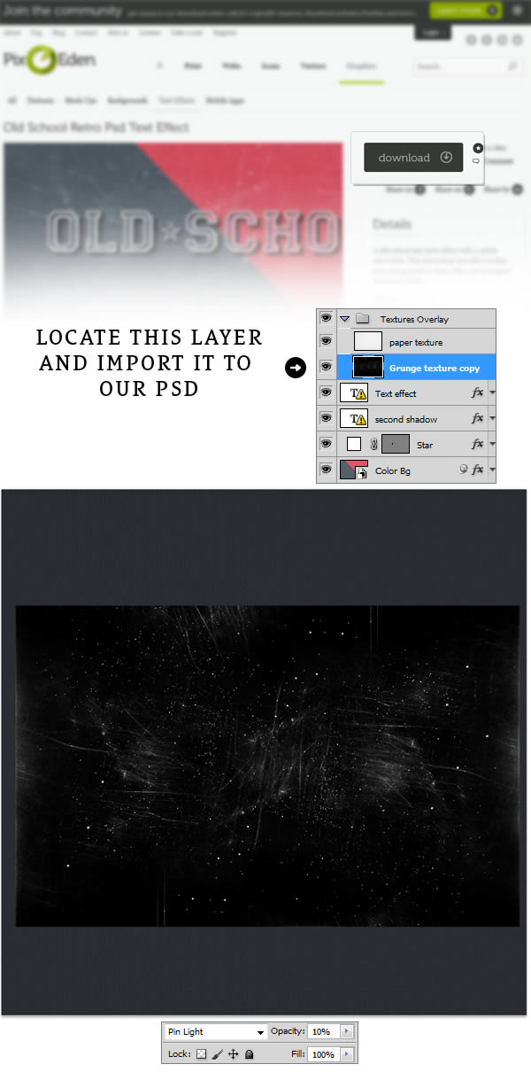 Скачайте Grunge текстуру. После того как вы загрузили файл, откройте его в Photoshop и найдите слой под названием Grunge Texture. Импортируйте этот слоя в PSD и установите режим смешивания на Pin Light и непрозрачность на уровне до 10%. Сделайте этот слой Clipping Mask.