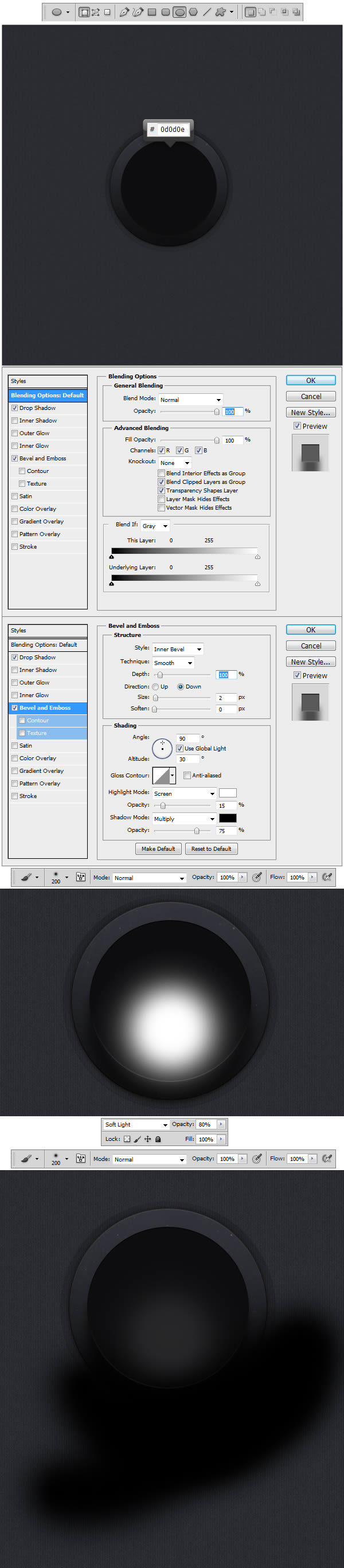 Используя Elipse Tool (U) сделайте еще один идеальный круг меньшего размера, чем до него, установите цвет # 0d0d0e и примените стили слоя. Используя Brush Tool (B), установите размер кисти 200px и Hardness 0% и сделайте белым # FFFFFF точку, как в нашем примере. Установите режим смешивания на Soft Light, а непрозрачность на уровне до 80% и превратите этот слой в Clipping Mask. Теперь создайте новый слой, измените цвет на черный # 000000 и кистью зарисуйте вокруг нижней части круга, как показано на примере. Преобразуйте этот слой в Clipping Mask также.