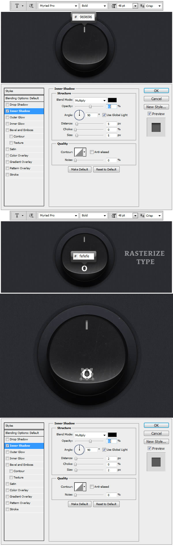 Используя инструмент Horizontal Type Tool (T), установите шрифт Myriad Pro (стандартный шрифт), Bold и размером 48pt и запишите букву «I». Установите цвет # 969696 и примените стиль слоя.Сделайте еще один тип, на этот раз «O», установите цвет # fefefe. Щелкните правой кнопкой мыши на слое и выберите Rasterize Type. Теперь нажмите CTRL + T и удерживая Ctrl + SHIFT + ALT перетащите в левый нижний угол на несколько пикселей. Примените стиль слоя.