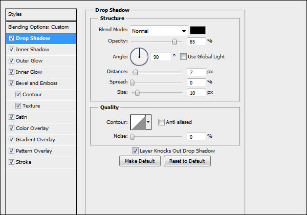 Теперь пишем свой текст с помощью шрифта Cafe Nero M54 белым и примените стили слоя, как показано ниже. Открытие стилей слоя: двойной клик на слое с текстом или перейти к Layer> Layer Styles> Blending Options.