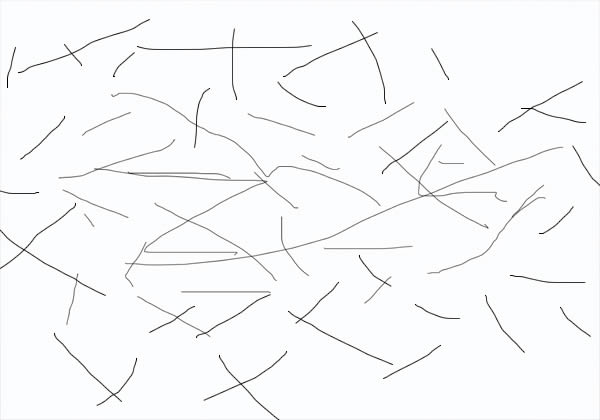 Мы собираемся создать два следующих моделей самих себя. Создайте новый слой в документе шаг 1, зайдя в Layer> Layer New>. Заполните слой белым, перейдя в Edit> Fill и выберите белый. Теперь возьмите кисть и установите размер кисти на 1 пиксель и твердости до 100% набросайте несколько черных линии, как показано ниже. Чем больше линий, тем больше царапин на текстуре получится.