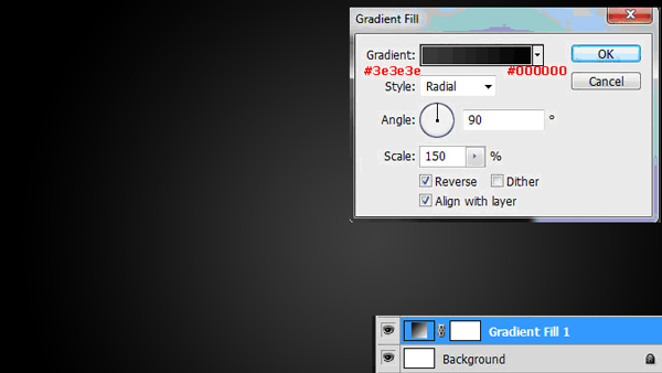 Сначала мы создадим фон, где наш текст будет находиться. Создайте новый документ в Photoshop 1920 × 1200 (формат обоев). Оставьте фоновый слой в покое, добавьте новый слой Gradient Fill, используя настройки показаные на рисунке ниже.