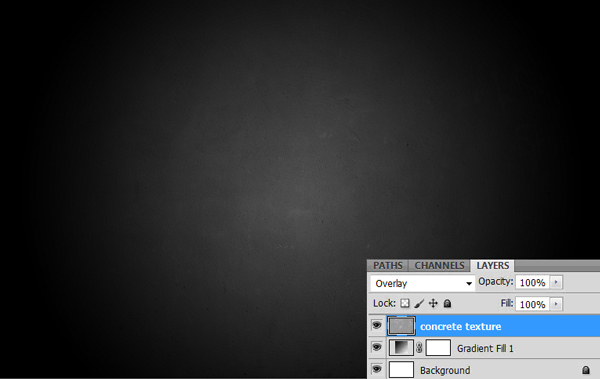 Вставьте текстуру выше градиента, которая и будет вашим фоном. Вы должны уменьшить текстуру до размера вашего документа. Измените его режим смешивания на Overlay и обесцветьте с Shift + Ctrl + U.