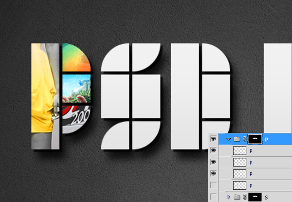 Теперь вставьте часть фотографии за буквы, чтобы перекрыть новый слой внутри группы. Поскольку у нас есть несколько частей на каждую букву, у нас будет новый слой для каждой части. См. изображение ниже.
