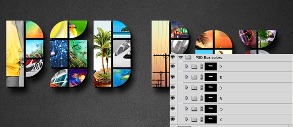 Когда украсили одну букву, создаете новую группу и просто копируете маску слоя из первой группы и повторяете процесс. Вы можете использовать часть изображения на несколько слоев, просто убедитесь, что они из разных областей в противном случае будет заметно, что вы использовали тот же образ. Это очень простой процесс, но может быть, занимает просто много времени.